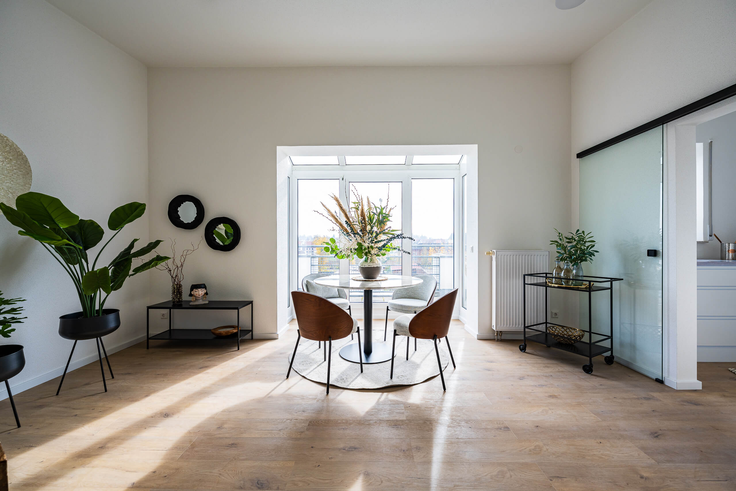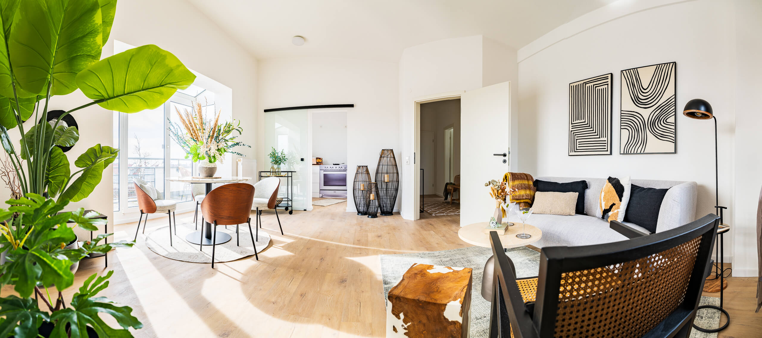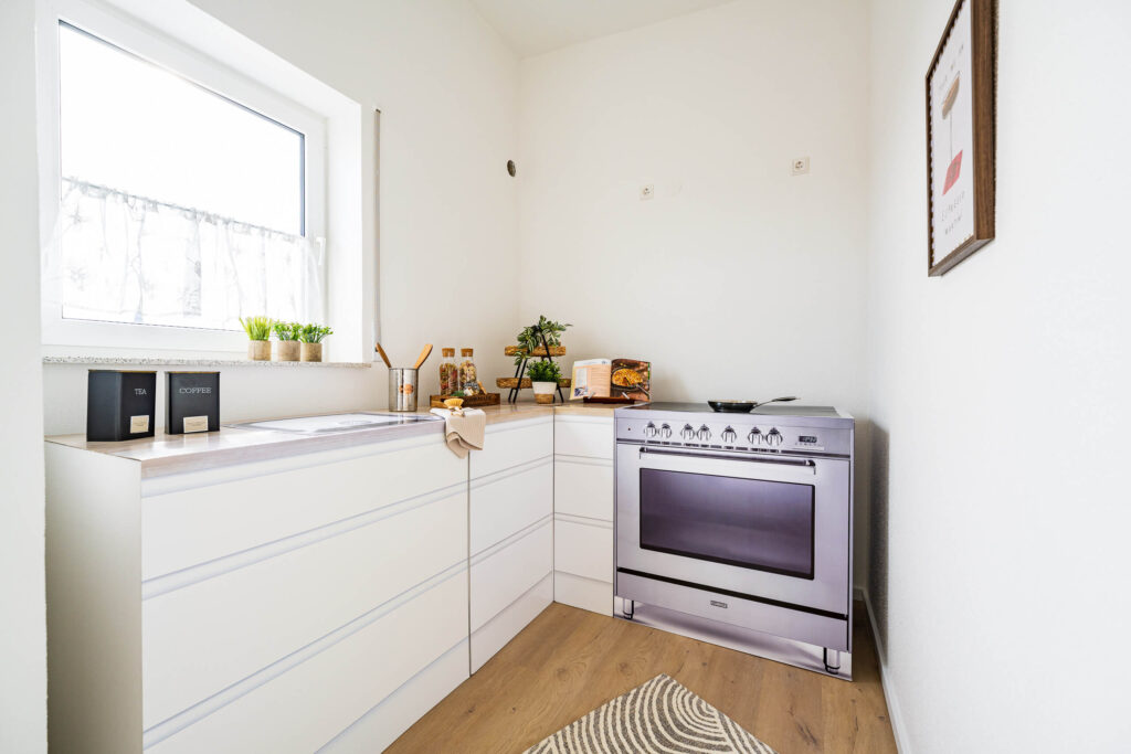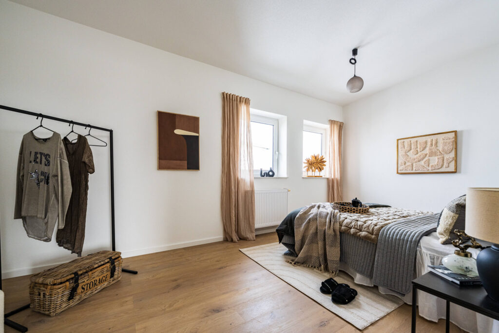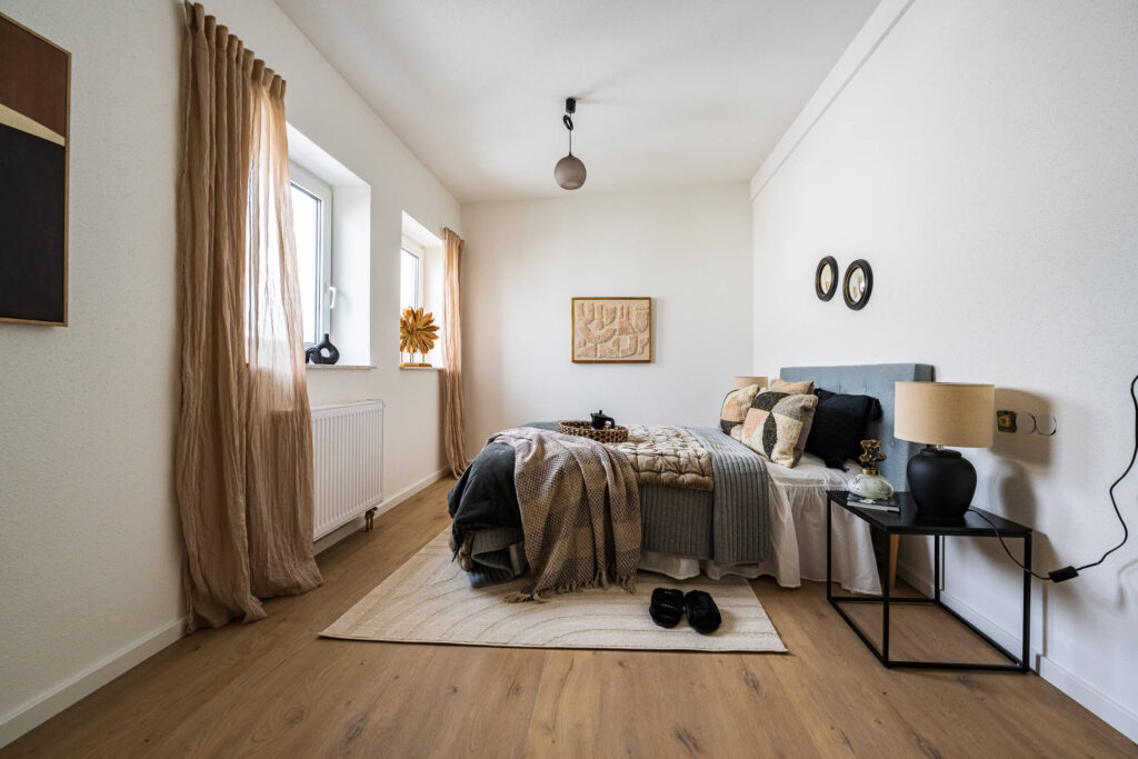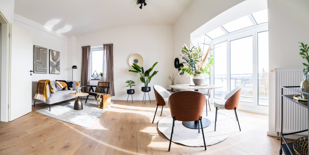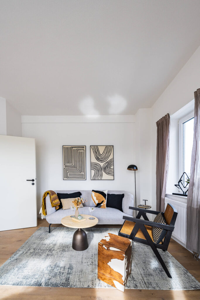 Dieses Homestaging wurde nicht dekoriert, sondern komponiert. Jede Linie, jede Fläche und jede Sichtachse folgt der Architektur des Raums. Die hohen Decken, das Licht und die Materialität wurden bewusst aufgenommen und weitergeführt – damit der Raum das zeigt, was ihn wirklich ausmacht.